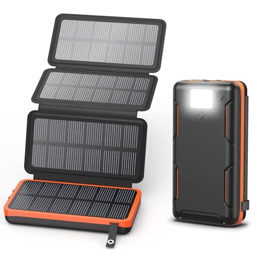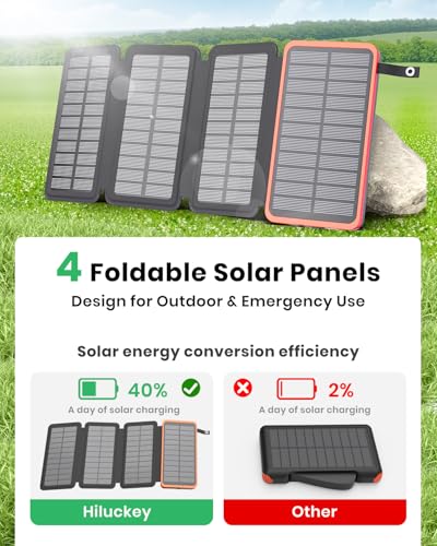Hiluckey Solar Power Bank 25000mAh – Portable Solar Charger with 4 Foldable Panels – PD QC 3.0 Fast Charging Battery Bank with USB C Output/Input – Outdoor Battery Pack with Flashlight for Camping