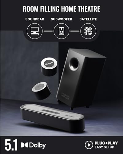 𝗣𝗥𝗘𝗠𝗜𝗨𝗠 𝗕𝗨𝗜𝗟𝗗 𝗪𝗜𝗧𝗛 𝗧𝗥𝗨𝗘 𝗦𝗨𝗥𝗥𝗢𝗨𝗡𝗗 𝗦𝗢𝗨𝗡𝗗: Engineered for high-quality audio performance, the dedicated 5.1 speaker configuration delivers accurate channel separation, clear dialogue, and immersive surround effects. With precisely positioned front, centre, rear, and subwoofer channels, this home theater sound system creates a rich, cinema-style soundstage that brings movies, games, and music to life.