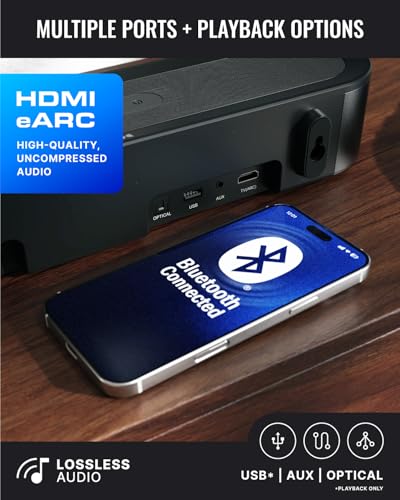 𝗩𝗘𝗥𝗦𝗔𝗧𝗜𝗟𝗘 𝗖𝗢𝗡𝗡𝗘𝗖𝗧𝗜𝗢𝗡𝗦 & 𝗛𝗜𝗚𝗛-𝗥𝗘𝗦 𝗔𝗨𝗗𝗜𝗢 𝗣𝗟𝗔𝗬𝗕𝗔𝗖𝗞: Connect effortlessly via Bluetooth 5.3, HDMI ARC with HDMI CEC, Optical input or AUX line-in. Enjoy direct playback of MP3, FLAC, and WAV files from USB storage up to 32GB. Majority Bowfell Halo offers broad compatibility across TVs, consoles, and media devices, making it a perfect soundbar for TV or PC.
