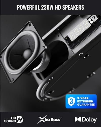 𝗣𝗢𝗪𝗘𝗥𝗙𝗨𝗟 𝟱.𝟭 𝗦𝗨𝗥𝗥𝗢𝗨𝗡𝗗 𝗦𝗢𝗨𝗡𝗗 𝗣𝗘𝗥𝗙𝗢𝗥𝗠𝗔𝗡𝗖𝗘: Experience rich, room-filling sound with a true 5.1 surround sound system delivering 230W of power. Featuring Dolby Audio, Dolby Surround, and PCM support, this premium setup combines a high-performance sound bar, wired subwoofer, and two wired rear speakers for detailed, cinematic home theatre sound.