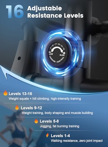【16-Level Adjustable Resistance】The elliciptial machine equipped with a 16-Level magnetic resistance system that can be easily adjusted by turning the knob. It meets strength requirements from beginner to professional levels. High-resistance settings challenge your physical limits, while low-resistance modes focus on body shaping and fat loss. Whether you are a fitness newbie or a seasoned athlete, you can customise your own exercise intensity to meet the fitness needs of different stages.
