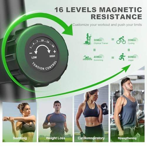 【Adjustable 16 Levels Resistance】The cross trainer is equipped with 16-level magnetic resistance. Whether beginners or professionals by easily adjusting the tension knob to meet the daily training and enjoy a low-impact workout of varying intensities.