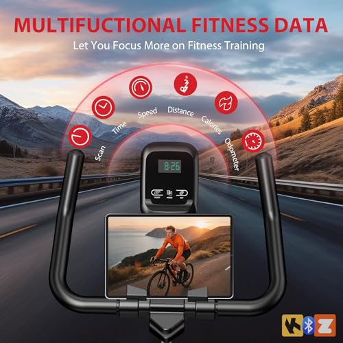 Exercise Bike Compatible with Fitness APP: Advamsoler upgraded exercise bikes compatible with Zwift and Kinomap apps, allowing you to immerse yourself in interactive cycling experiences right from the comfort of your home. The LCD monitor on the spin bike can track the time, speed, distance, calories burned, and odometer, helping you track your workout data effectively