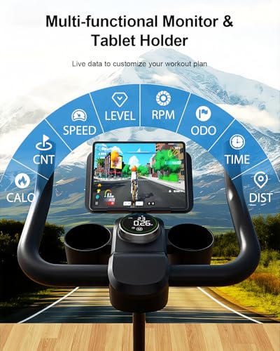 Excellent Quality and Stable Structure:Our exercise Bike feature a scientifically designed triangular structure with excellent load-bearing performance, and can easily withstand weights of up to 136 kg. The frame is made of high-quality materials to ensure that the bike remains stable under high-speed operation and high-intensity use. (Tablet on the stand: display ONLY, not sold as an accessory.)