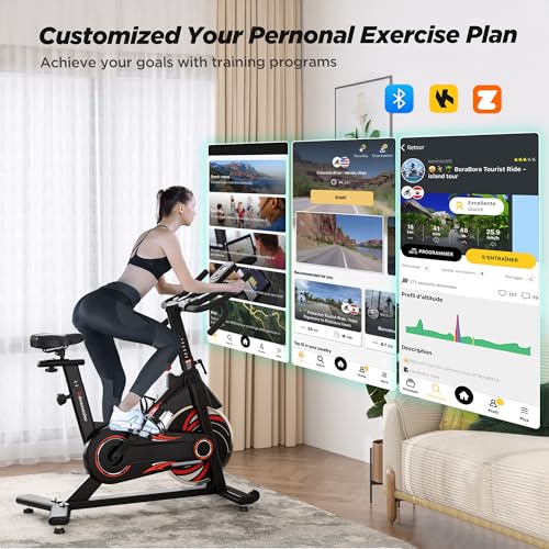 Exercise Bike, Spin Bike with App for Home Use, Indoor Cycling Bike with Curved Handlebar, Stationary Bike with LCD Display & Bluetooth Connection, Comfortable Seat, 350LBS Capacity