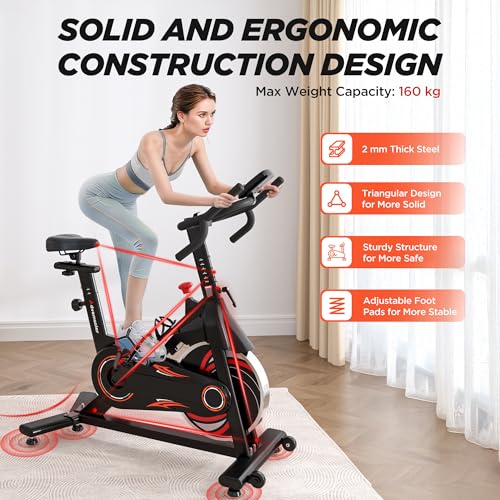 Smooth & Quiet Cycling Spin Bike: This home exercise bike equipped with a belt-driven system, ensuring a silent, stable, and low-maintenance workout experience. Let you enjoy a quiet and comfortable cycling experience without worrying about noise or disturbing others.