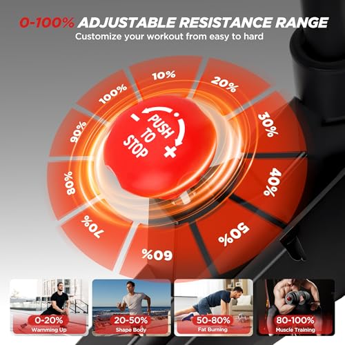 Micro-Adjustable Resistance: This spinning bike offers a 0-100% of micro-adjustable resistance design, allowing you to find the right level of training difficulty for everyone from beginners to advanced users. The manual one-button stop knob device can immediately stop the flywheel to ensure maximum safety.