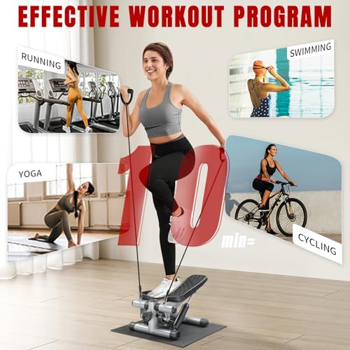💪【TOTAL BODY WORKOUT】Come with a resistance band, the stepper also tones your waist, upper body and more. A mini stepper built with an LCD display that shows exercise steps, exercise time, total count, and calories in real-time allowing you to keep track of your progress easily.