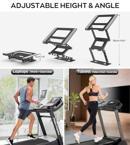 【STABLE TREADMILL LAPTOP HOLDER】The desk for treadmill is made of high-strength carbon steel material and scientific structural design, stable support for your laptop and tablet. Treadmill desk tray non-slip design on the edges prevents the device from slipping, so that you can exercise with more peace of mind