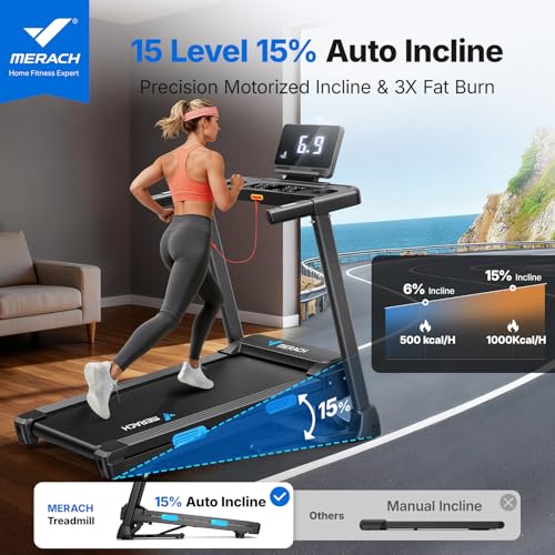 【Advanced 15% Auto-Incline Treadmill】The MERACH Auto Incline Treadmill now features an industry-leading 15% incline—significantly steeper than standard treadmills. With no manual height adjustments required, simply control the slope via the console to boost fat-burning efficiency by up to 70%! Make calorie burning effortless. Speed range: 1-12 km/h.