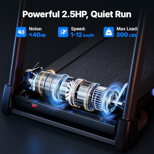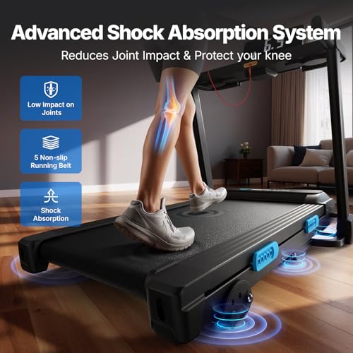 【Extra-Wide Running Belt & Shock Absorption System】This treadmill with incline features an oversized running belt measuring 41.3 inches x 16.5 inches, providing ample freedom for walking or running. The treadmill for home also incorporates a five-layer running belt and six shock absorption pillars, effectively absorbing impacts and significantly cushioning shocks to knees, muscles, and joints.