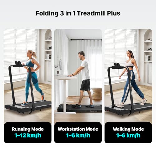 3 IN 1 WALKING、WORKSTATION & RUNNING: 3-in-1 folding under desk treadmill with running mode speed from 1 to 12 kmh, workstation mode speed from 1 to 6 kmh and walking mode speed from 1 to 6 kmh, it’s perfect for walking, jogging, working and running. Use a portable walking pad treadmill for multitasking. This flat treadmill suits all fitness levels. Walk while you work with ease. Balance your work and life.