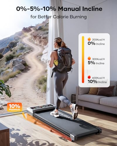 【Walking Pad Treadmill with 3 Incline Levels】With a speed range of 1-10 km/h, this treadmill is suitable for walking, jogging and running at home, in the office or in the apartment. The newly improved version features a 3-level incline adjustment (0%-5%-10%), which simulates an incline scenario more realistically than other walking pad, helping you burn more calories. 2 steps to quickly adjust the incline of the treadmill
