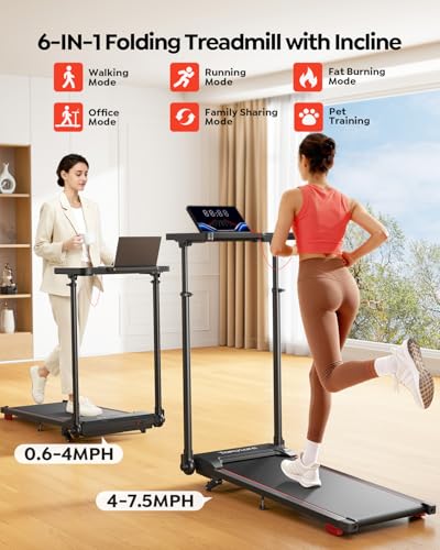 Toputure 6 in 1 Folding Treadmill with Retractable Handrail, 1%-5%-10% Incline Walking Pad Treadmills for Home, 1-12KM/H Foldable Treadmill with Table, Cup Holder, App, Magnetic Remote & LED Display