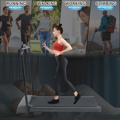 4 IN 1 TREADMILL – With adjustable speed setting, you can choose 4 different workout modes just in 1 treadmill! 4-8km/h for running, 3-5km/h for walking, 1-2km/h while working, 1°- 6.5° incline for climbing