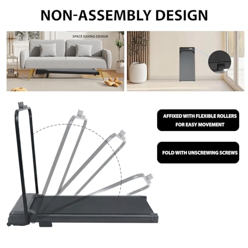 NON-ASSEMBLY DESIGN & SPACE SAVING – Plug in and use our treadmills to exercise right away! Compared to traditional treadmills, our under desk treadmills eliminate the tedious assembly process and potentially high assembly costs. You can easily put up the foldable handrail and phone/pad holder. This walking pad is also easy to move and store, which is perfect for small room. Our treadmill can be easily placed under the sofa, corner or bed. Save a small amount of floor space when the machine is not in use!