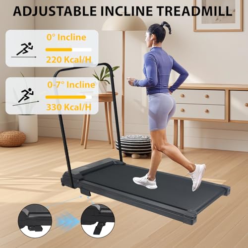 INCLINE ADJUSTMENT – Compared with a regular walking machine, this walking running pad equipped with 0-7° incline, creating a condition like a little hill for walking. Specifically designed to shape your hips and legs, with which the effect of fitness and fat-burning can increase by 50%