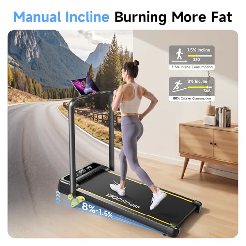 【3 Level Incline Treadmill】YPOO walking pad with handle offers a unique 8% manual incline, boosting calorie burn by up to 60% compared to a regular treadmills for home. With the adjustable incline of the folding treadmill,you can tailor your workout to meet your fitness goals, enhancing your home exercise experience.