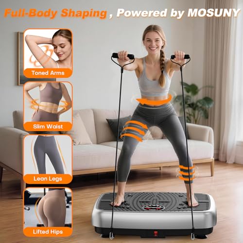 【Build Your Dream Body】Step onto MOSUNY vibration plate and sculpt your ideal figure instantly! Our vibration exercise machine uses high-frequency oscillations to stimulate muscle fibers faster than traditional workouts, triggering continuous micro-contractions, such as the waist, abdomen, buttocks, and legs, for a full-body workout.The vibration plate for lymphatic drainage,helping to increase the body’s metabolic rate and promote blood circulation and metabolism, Pair our vibration platform machines with the resistance bands for a more effective workout!