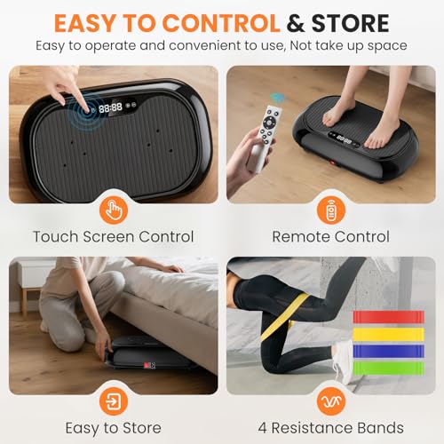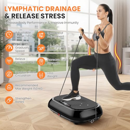 Vibration Plate, Vibration Plate Exercise Machine with 9 Modes, 120 Intensity Levels, 4 Resistance Bands, 150 kg Capacity, Built-in Bluetooth Speaker, Remote Control, for Full Body Workout
