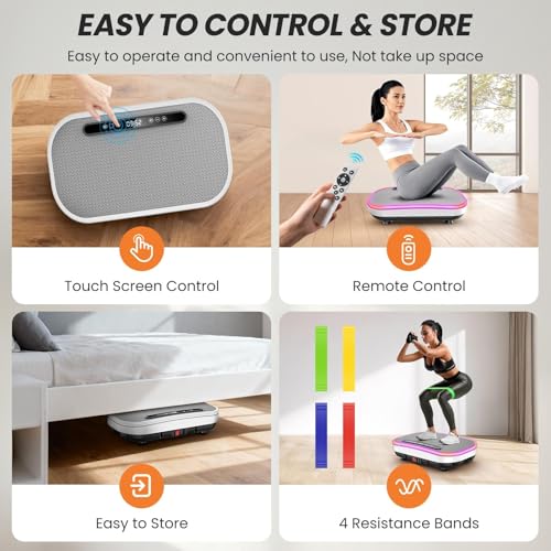 【Vibration Platform】This vibration platform is designed to work all your muscles and improve your balance, flexibility, and much more. Its versatility allows you to target different areas of your body, including arms, abdomen, glutes, thighs, and calves. It also comes with four resistance bands (4.5 kg, 6.8 kg, 9 kg, and 11.3 kg). Use our vibration platform with resistance bands for a more effective workout!