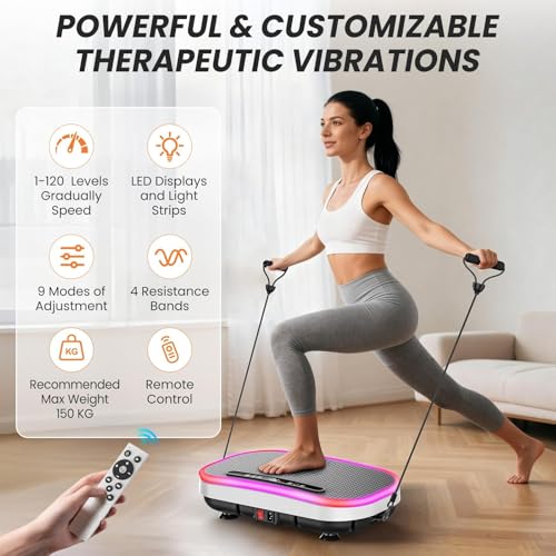 Vibration Plate, Vibration Plate Exercise Machine with Resistance Bands, 9 Adjustable Modes, 1-120 Intensity Level, Bluetooth Support, Remote Control, LED Display, Load-Bearing Capacity 150KG