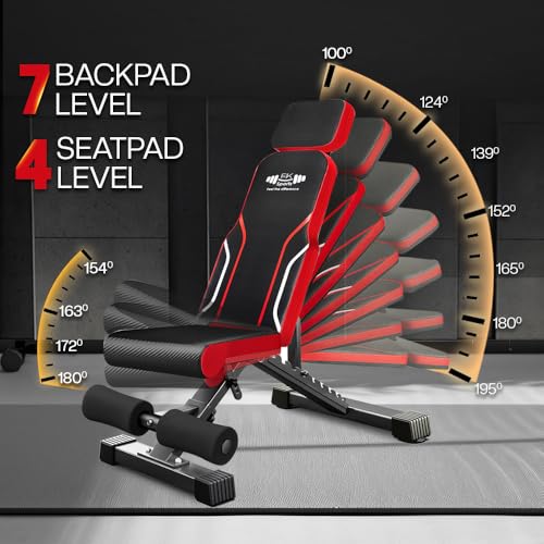 [7-Position Adjustable Backrest – Full Incline, Flat & Decline Training] This adjustable weight bench features 7 backrest positions, from decline to upright, plus adjustable seat angles for maximum versatility. Perfect as an incline bench, flat gym bench, or decline exercise bench to target chest, shoulders, arms, abs, and more in your home gym.