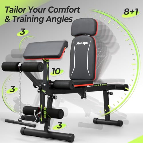 [Upgraded Versatile Adjustable Weight Bench] Master 9 back positions (incline/flat/decline) + 3-way headrest for perfect form; torch chest, abs, back, legs, arms and more with the 3-angle, 10-height preacher pad and 3-position leg roller; includes weight rod and chains for heavy lifts, your all-in-one home gym bench, custom support for every move