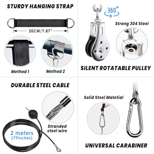 【Easy to Use】 Steel carabiners for quick setup and removal. Just hang weight pulley system on hooks or bars. Compatible with power racks, squat stands, pull-up bars, beams, ceiling hooks, door anchors, and any place with a stable overhead mount.