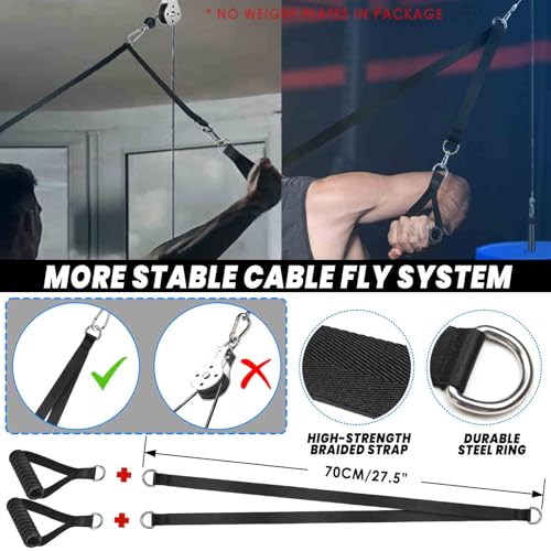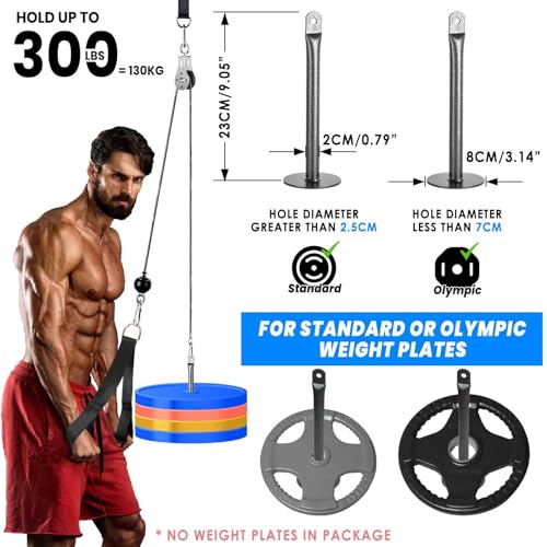 【Smooth & Quiet】Noise-free pulleys and 2-meter steel cable. Lightweight and comfortable triceps strap. Connect D-handle to extension strap for stable cable fly. EVA-wrapped handles offer comfort and grip. 23cm loading pin fits any weight plates with a 2.5-7cm hole diameter. Gym pulley system supports up to 130kg/300 lbs. (Weights not included)