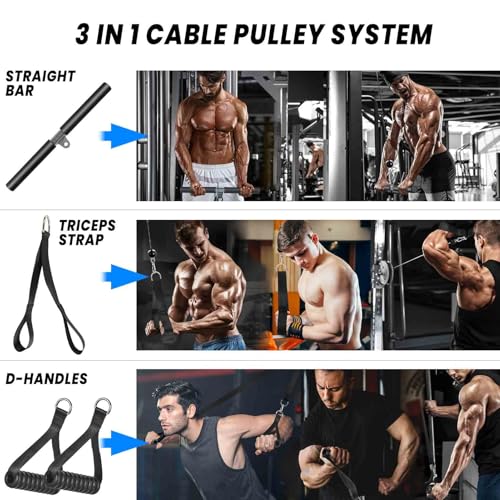 【Versatility】Includes straight bar, triceps strap, D-handle, and extension strap. Lyndwin cable pulley system home gym targets various muscle groups like arms, chest, shoulders, back, core, and abs. Suitable for bicep curls, triceps press-downs & extensions, cable flys, face pulls, chest presses, crunches, and rows.
