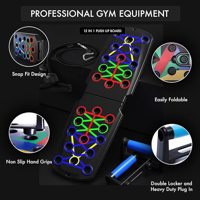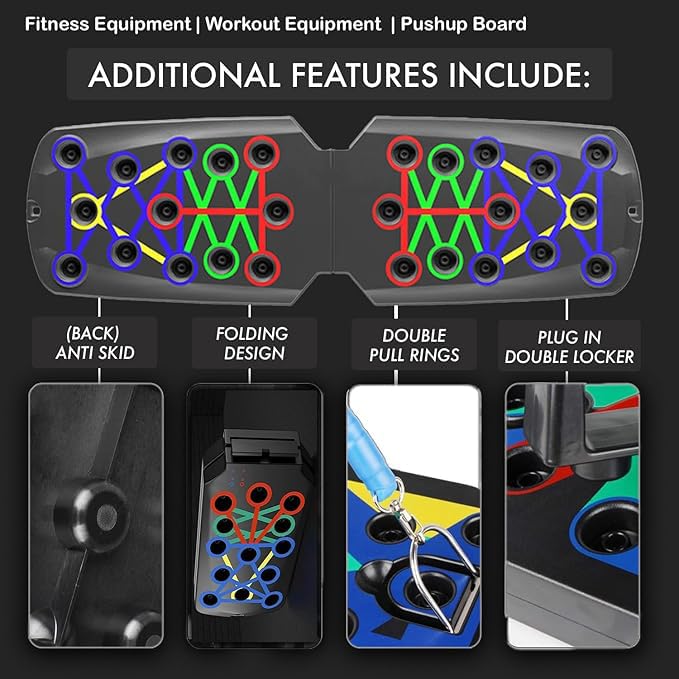 💪 20-in-1 Push Up Board with Resistance Bands Target chest, shoulders, triceps, back, and core with this full-body workout system. Our press up board includes resistance bands for extra muscle training, offering a complete home gym experience.