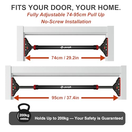 Pull Up Bar for Doorway No-Screw, Adjustable Width (74-95cm), 200kg/440 lbs Capacity, with 360° Lock & 2x EXTRA Foam Padding for Ultimate Door Frame Protection, Home Chin Up Bar