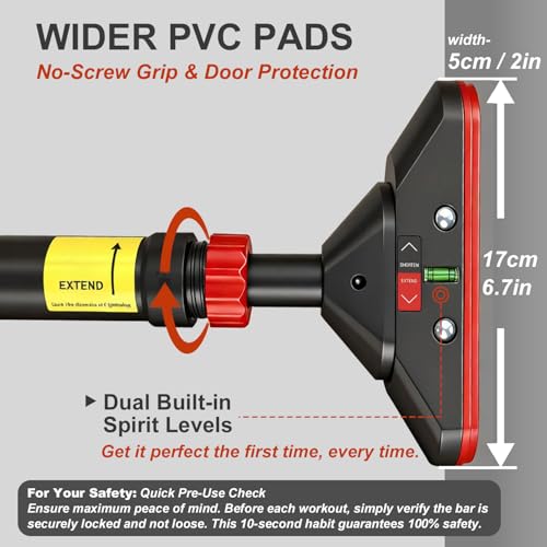 【Effortless Setup & Reliable Support】Install in seconds with guided arrows, dual spirit levels, and video instructions. Simply extend, lock, and train with confidence. (Note: Always check the bar is secure before use. Our support team is on standby 24/7 to assist with any queries.)