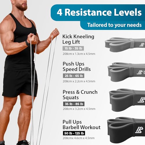 FULL BODY WORKOUTS, GRIP PADS & DOOR ANCHOR: This pull up assist bands set comes with 4 different colour-coded resistance levels available to help you increase and decrease weight intensity clearly marked 15-35LBS, 25-65LBS, 35-85LBS, 50-125LBS. These multipurpose bands can be used for different exercises such as strength training, assisted pull-ups, tension training, warm-ups and can also be used to stretch out before and after deadlifts and squats.