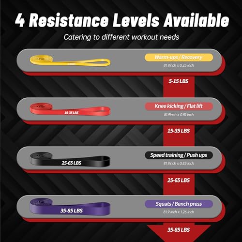 【Scientific Resistance Evolution Design】: The five resistance bands set features ergonomic engineering with scientifically progressive resistance levels, covering strength needs of 5-125 pounds: Yellow 5-15 pounds, red 15-35 pounds (for arm workouts), black 25-65 pounds, purple 35-85 pounds(for leg and back workouts). This system authentically replicates professional gym equipment training, offering both beginner-friendly simple modes and advanced difficulty modes to meet diverse strength needs.
