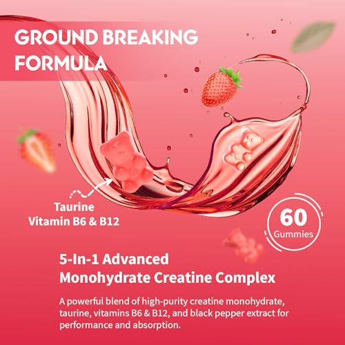 Creatine Gummies 5000mg, 5-in-1 Vegan Supplement with Taurine, B6 & B12, for Energy, Endurance & Muscle Builder, Low Sugar, High Absorption, Natural Berry, 60 Count