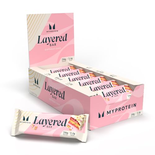 MyProtein Layered Protein Bar – Vanilla Birthday Cake Flavor, 20g Protein, Low Sugar & High Fibre, 12 x 60g Bars, Multilayered Snack for Active Lifestyles