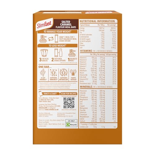 SlimFast Salted Caramel Meal Bar, 16 g Protein, 202 Calories, 27 Vitamins & Minerals, Have as a Meal Replacement for Weight Management or as a High-Protein Snack for Work, Gym & Travel, 4×60 g