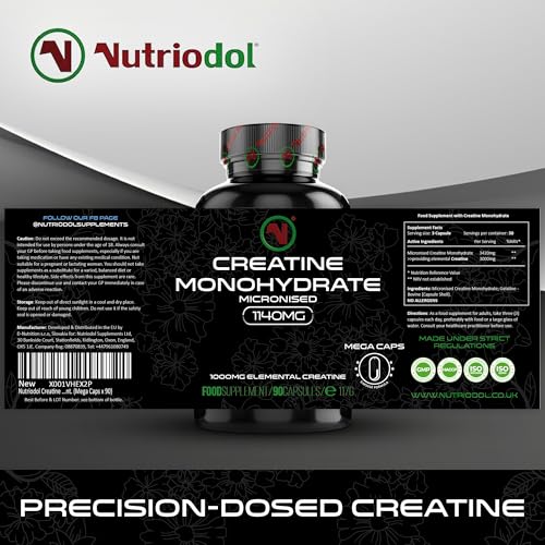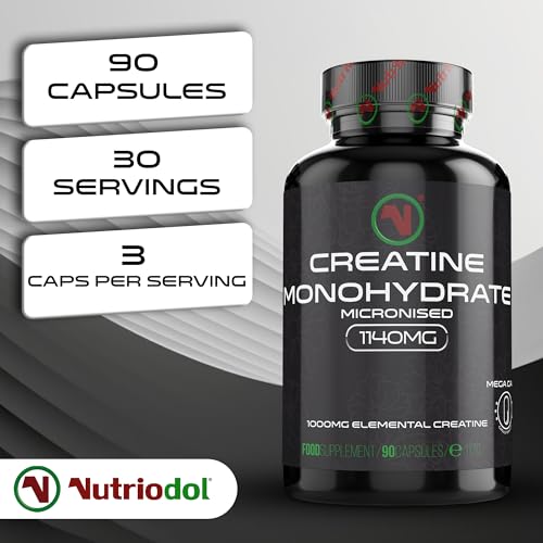*1140mg of Micronised Creatine Per Capsule: Each Nutriodol Mega Capsule contains 1140mg of premium micronised creatine monohydrate, providing 1000mg of pure elemental creatine to support muscle strength, endurance, and recovery.