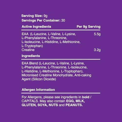 Ingredients: EAA Blend (L-Leucine, L-Valine, L-Lysine, L-Phenylalanine, L-Threonine, L-Isoleucine, L-Histidine, L-Methionine, L-Tryptophan), Micronised Creatine Monohydrate, Flavouring, Anti-caking Agent (Silicon Dioxide), Citric Acid, Sweetener (Sucralose), Colouring (Beetroot).