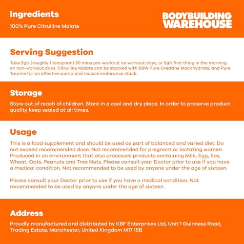 ✔️ UK Manufactured – Pure Citrulline Malate (2:1) – from Bodybuilding Warehouse is a high quality 100% pure Citrulline Malate supplement, manufactured in our own state-of-the-art facility.