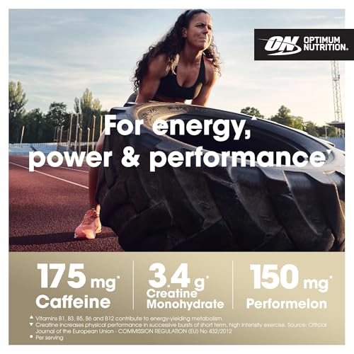 Discover Optimum Nutrition Gold Standard Pre Workout Powder. This ready-to-mix energy drink is designed to improve your focus, power, and performance* before and during your workout. ON Gold Standard food supplement is Informed Choice Certified and contains a carefully-selected list of ingredients. It’s packed with 175 mg of caffeine from natural sources to help increase alertness and focus before training*. Each serving provides 3.4 g of creatine monohydrate that helps support your power,and performance,. This great-tasting sports drink also contains Vitamins B 1, B 3, B 5, B 6, and B 12, which all contribute to normal energy-yielding metabolism**. On top of that, it also includes Beta-Alanine (Carnosyn), Citrulline, L-Carnitine, and N-Acetyl-Tyrosine. A variety of flavours – Fruit Punch, Green Apple, Watermelon, Blue Raspberry, and Kiwi – means that you don’t need to sacrifice flavour for your energy, focus, and performance gains. The pre-workout supplement is designed for everyone: from those just starting on their path to leading a healthier lifestyle to athletes, hard-working students, professionals, and fitness lovers. Optimum Nutrition Gold Standard Pre Workout Powder is a tasty pick-me-up that doesn’t break the bank and can be enjoyed at any time and anywhere; at home, on the go, or at the gym. To prepare a tasty shake, add 1 level scoop to 350 ml of cold water, mix, and serve. *Source: EFSA Journal 2011;9(4):2054 24 **Source: COMMISSION REGULATION (EU) No 432/2012