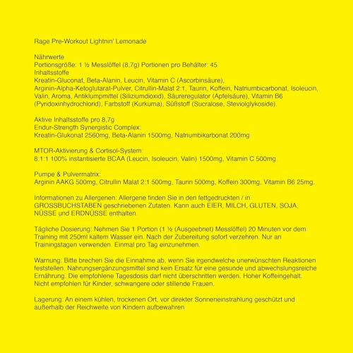 Warrior Rage Pre Workout Powder 392g (45 Servings) – 300mg Caffeine High Stim Energy Drink Supplement + Beta-Alanine, Creatine, BCAA, Taurine, Citrulline & Arginine AAKG for Muscle – Lightin’ Lemonade