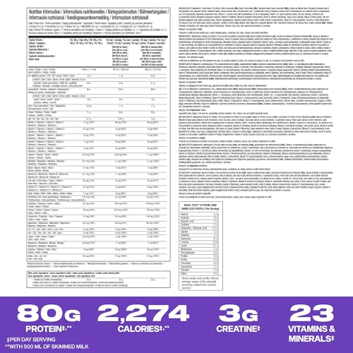 Get bigger and stronger; each serving of the 5-In-1 mass gainer formula has 80 g protein, Over 400 g carbs, over 2,000 Calories, 3 g creatine And 23 vitamins and minerals