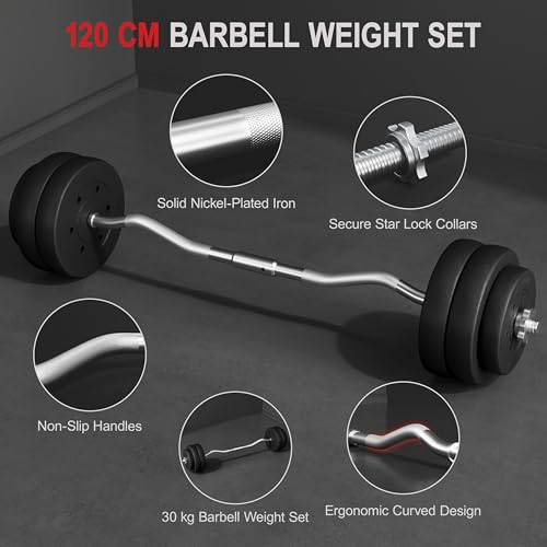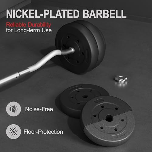 Durable and Sturdy: The concrete-filled weight plates are encased in a robust HDPE coating for added protection, while the curl bar is crafted from solid nickel-plated iron, providing enduring strength and reliable performance