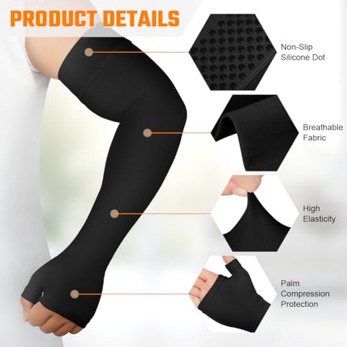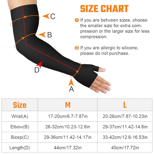 【HIGHLY ELASTIC AND BREATHABLE】Our compression arm sleeves are highly breathable and moisture-wicking, promoting air circulation and quickly evaporating sweat, keeping your arms dry all day long. Their medical-grade fabric provides moderate and even pressure, offering effective compression support while ensuring a comfortable and pain-free wearing experience. For best results, please select the correct size for your arm.