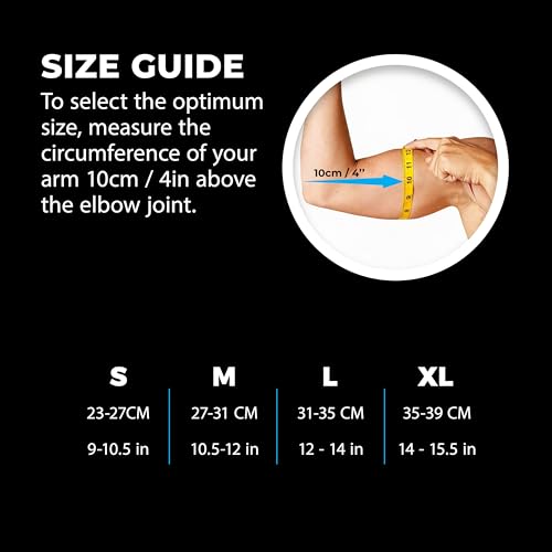 Elbow Support Women & Men: Our tennis elbow strap comes in S (7.8”-9.8”), M (9.8”-11.8”), L (11.8”-13.8″), and XL (13.8”-16”). Measure the circumference at the centre of your elbow to find your fit (see image guide). Go a size up if you’re near the upper limit, or size down for a tighter fit.