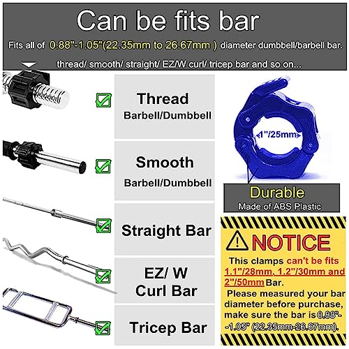 MULTI EXERCISES: the 1 inch fitness gym dumbbell barbell buckle is perfect for cross fitness training, overhead press, deadlifts, bench press, or any other workout using 1 inch dumbbell barbell bar, for thread and smooth barbell dumbbell, for straight and EZ/W curl bar, suitable for 0.88 inches to 1.05 inches