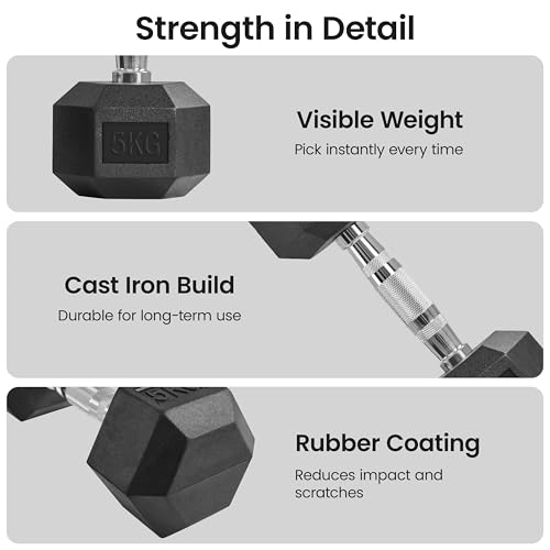 Yaheetech Hex Dumbbells Set with Work Guide, 2x5kg/2x6kg/2x8kg/2x10kg Dumbbells Pair, Anti-Roll Knurled Grip Rubber Dumbbells for Home Gym & Strength Training